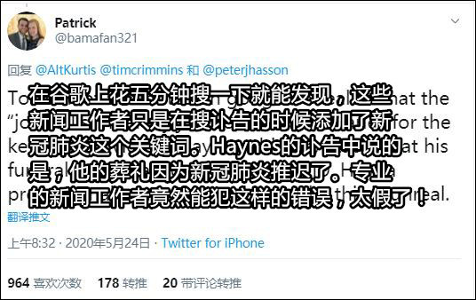 另一位網民則評論説,在谷歌上花五分鐘搜一下就能發現,這些新聞工作者只是在搜訃告的時候添加了新冠肺炎這個關鍵詞。而Haynes的訃告中説的是,他的葬禮是因為新冠肺炎推遲了。