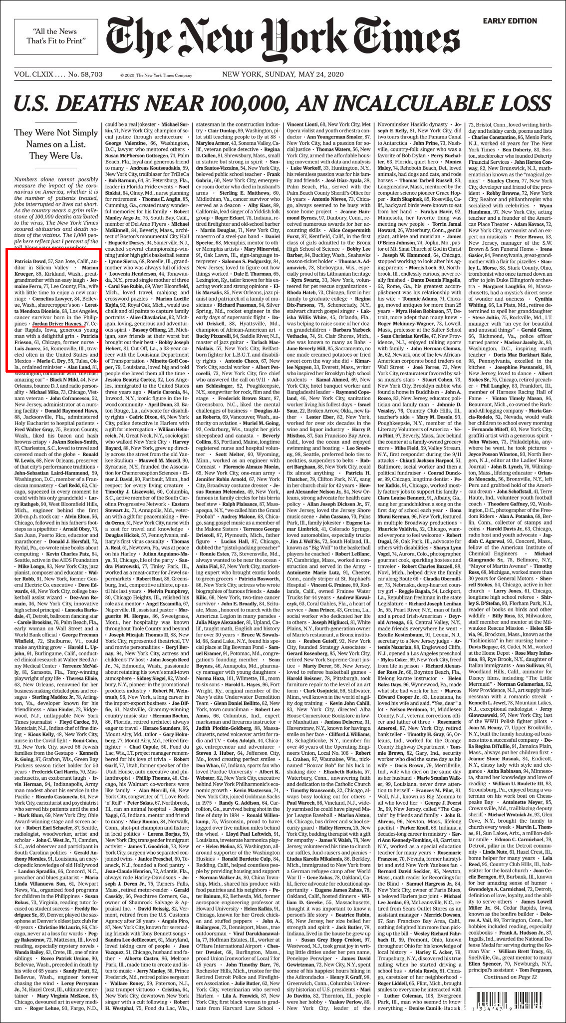 5月23日,美國自由派主流媒體《紐約時報》提前公佈了專門製作的24日紙質版頭條:整個版面被1000名新冠肺炎死者的名稱覆蓋,沒有任何新聞報道。大標題是“美國(疫情)死亡數接近10萬,損失無法計算”。