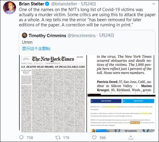 前《紐約時報》記者,現CNN首席記者Brian Stelter轉發了這位美國網民的推特解釋説:在《紐約時報》公佈的新冠肺炎的遇難者名單中,有一個人是死於謀殺。有些批評者用這一點攻擊整個報紙。關於這個錯誤有人告訴我“後續出版的報紙已經把它去掉了,一個正確的版本將被印刷”。