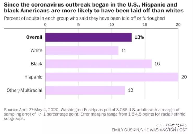 △《華盛頓郵報》民調數據顯示:拉美裔羣體和非洲裔羣體失業率高於白人羣體 蘇曉暉分析指出,在疫情蔓延期間,美國少數族裔的生產和生活條件直接關係到他們的患病率,甚至是生存問題。