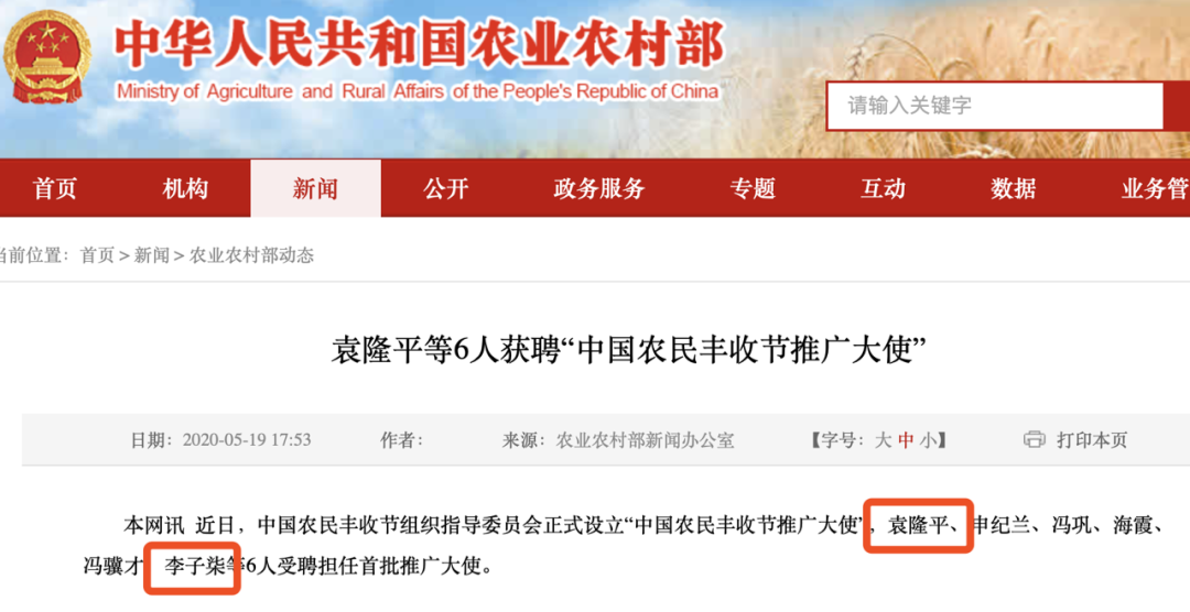 大意是説中國農民豐收節組織指導委員會正式設立“中國農民豐收節推廣大使”,受邀擔任首批推廣大使的有6個人。