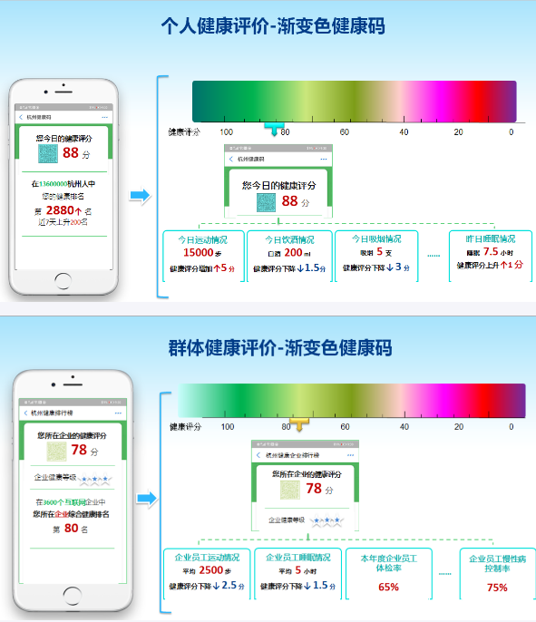 最近杭州要對深化杭州健康碼常態化應用做工作部署,提出了健康碼“一碼知健”的設計思路:通過集成電子病歷、健康體檢、生活方式管理的相關數據,在關聯健康指標和健康碼顏色的基礎上,探索建立個人健康指數排行榜。同時,也可以通過大數據對樓道、社區、企業等健康羣體進行評價。