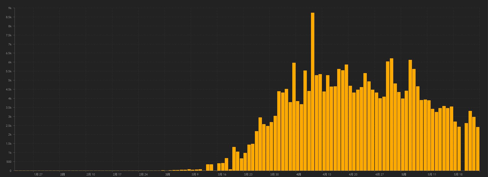 俄羅斯的形勢還不是很好,每日新增雖有下降,但還是很高。5月24日這天,俄羅斯新增確診8600餘人。