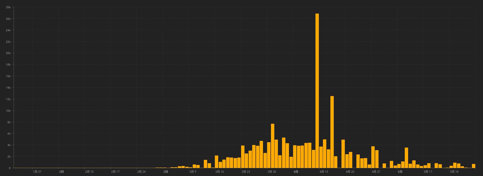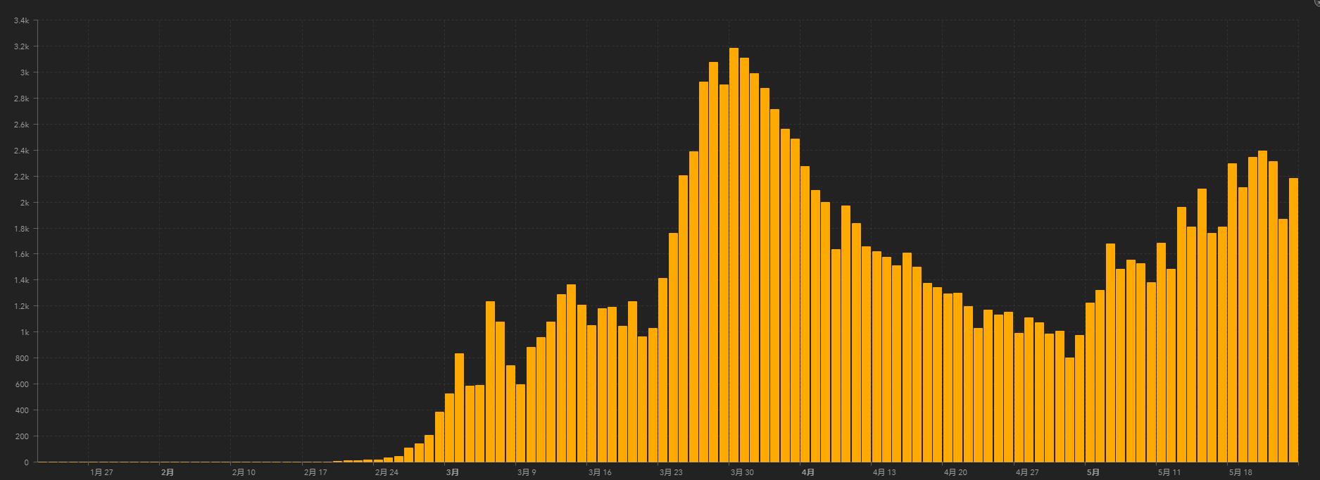 在伊朗的每日新增確診統計圖中可以看到,伊朗已經出現了第二波疫情。