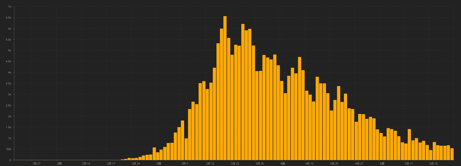 法國每日新增確診,已經維持到了比較低的水平。5月24日,法國新增確診673例。圖中最高的那根柱子,是4月12日法國新增確診最多的一天,有2.68萬例之多。