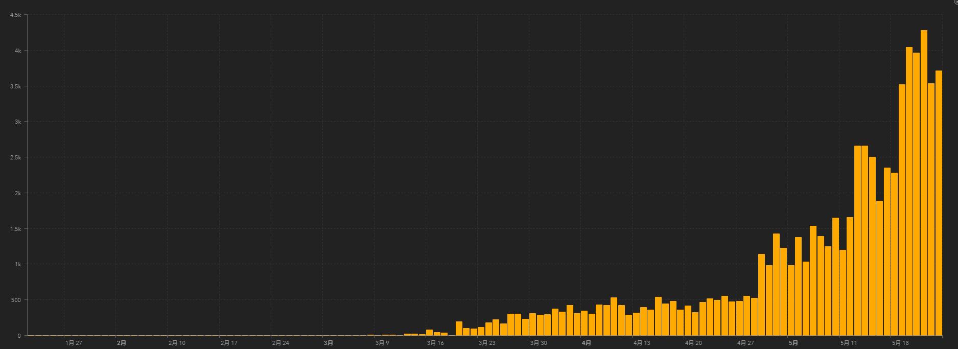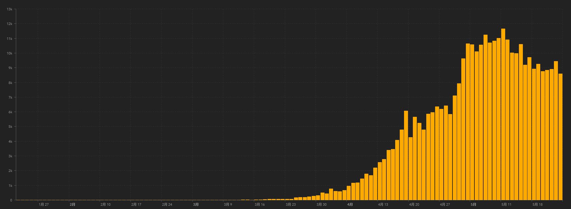 與巴西疫情形勢類似的還有印度,印度每日新增一直在上漲。