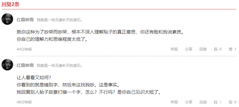 又是兩段回覆,還是在不停的強調自己是“故意”打錯,然後還開發出了帖子的真正意思、思維程度、見識等詞彙!