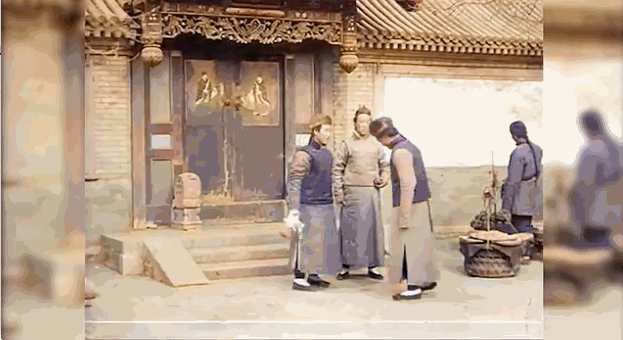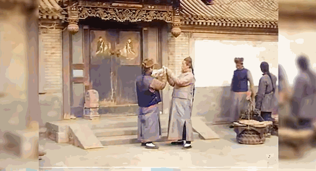 首先,大少爺出門買炭,遇到一位穿的很帥的,不知道提溜了個啥的朋友,倆人行了個滿人專用的“打千禮”。