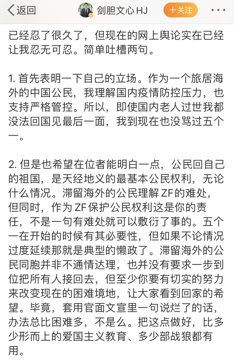 此前,一位在美國工作的博主也曾就此事發聲,和**@管清友**一樣,他認為“公民回祖國天經地義”、“政府有責任保護公民權利”。