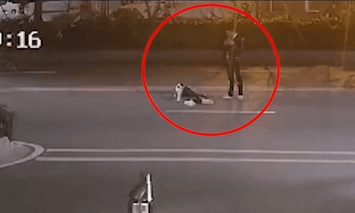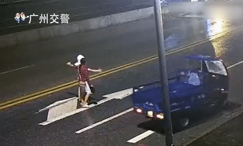 廣州交警公佈的監控視頻顯示,涉事情侶發生爭吵,男子跑到馬路中間,女子上前勸説離開卻遭男友一個肘擊,吃痛蹲到地上起不了身。然而,男子並沒有及時上前查看女友的情況,反而是張開雙臂面向車流,似乎是在等待車輛的撞擊。