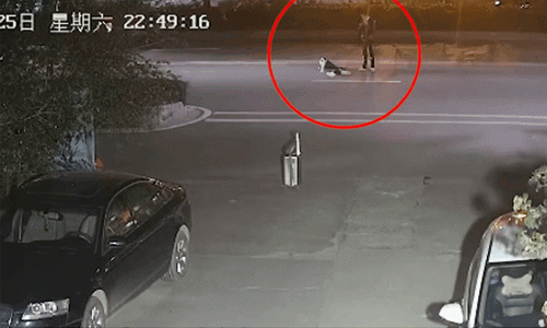 一輛黑色轎車疾馳而來,沒有注意到兩人,直接碾壓過去。男子初始時注意到了狀況,想要拽起女子,可是已經來不及了。