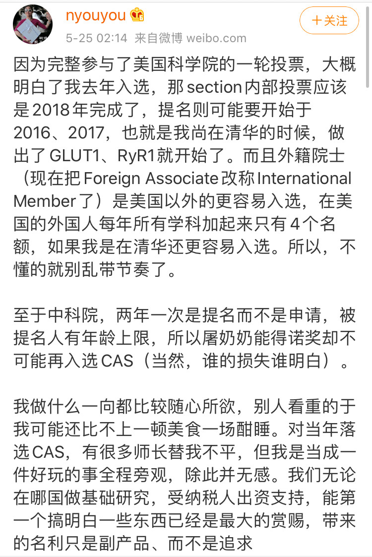 去年5月,有網友在微博發文稱,美國人詢問顏寧在2017年落選的原因,她回答道,“要想入選中科院院士,你可以不是一個優秀的人才,但你必須是一個聽話的人!”