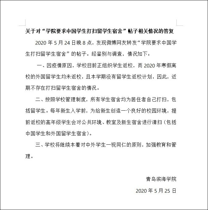 針對網貼所傳“學院要求中國學生打掃留學生宿舍”的情況,青島濱海學院25日凌晨3時5分許發表聲明做出答覆,稱網友反映的情況並不存在。
