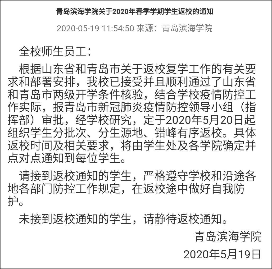 5月19日,青島濱海學院在官網發佈通知,披露有關於2020年春季學期學生返校的計劃:5月20日起組織學生分批次、分生源地、錯峯有序返校。具體返校時間及相關要求,將由學生處及各學院確定並點對點通知到每位學生。