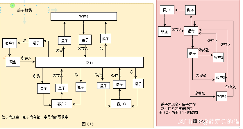 第二種貸款創造存款:圖(5)、圖(6)銀行把現金貸款給客户,而客户得到現金後又把現金存入了銀行。銀行的現金並沒有因此加多或者減少,但是客户卻在銀行裏多了一筆存款。不管這位客户是對存款進行轉賬或者其它別的經濟活動,或者呆者不動,只要不兑現,一筆存款就這樣被創造了出來。在這個過程中客户把資產抵押給了銀行,然後才獲得了存款,同時也“獲得”了債務。