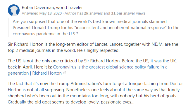 原文:https://www.quora.com/Are-you-surprised-that-one-of-the-world-s-best-known-medical-journals-slammed-President-Donald-Trump-for-his-inconsistent-and-incoherent-national-response-to-the-coronavirus-pandemic-in-the-U-S