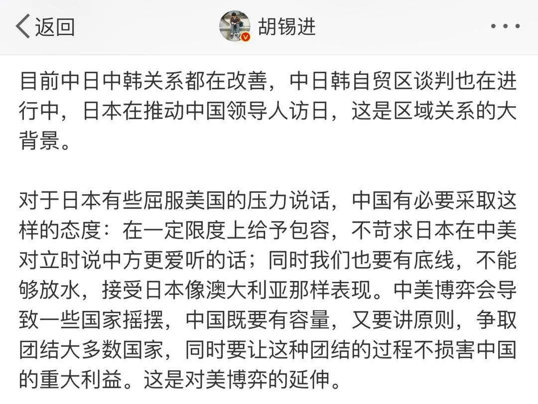 《環球時報》總編輯胡錫進説:“中美博弈會導致一些國家搖擺,中國既要有容量,又要講原則。”