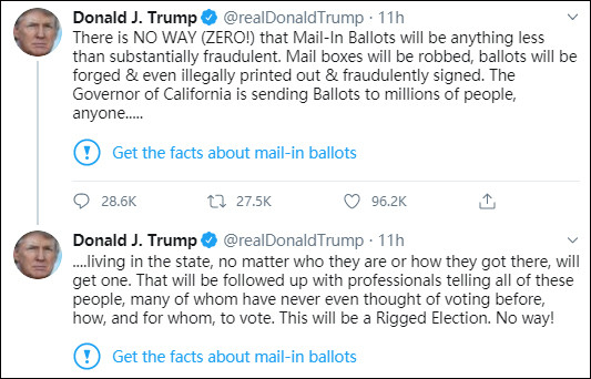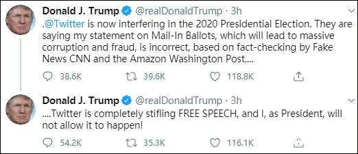 特朗普還表示,“推特正在干涉2020大選,他們説我‘郵寄選票將導致大規模的貪污腐敗和欺詐’的言論不正確,然而這是基於假新聞媒體CNN和《華盛頓郵報》的‘事實核查’……”