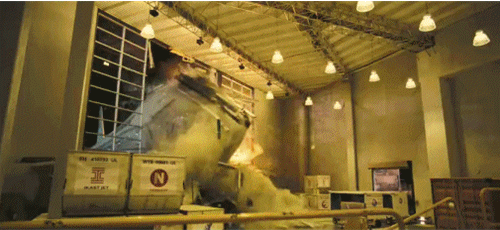 下一秒鐘,我們會看到,一架失控的飛機衝入機庫中,並起火冒煙,最終被炸燬。