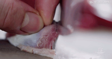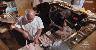 每片骨架下的肉要仔細剝離。翅中劈開,整齊串好。從肉到雜,一隻雞能精細區分出幾十種不同的美味。