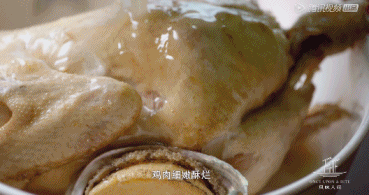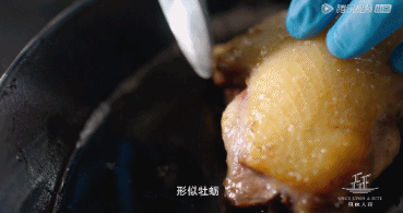 整雞處理乾淨,放入化開的麥芽糖上色後,高温油炸,雞皮褐化。