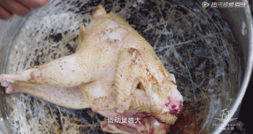 整雞處理乾淨,放入化開的麥芽糖上色後,高温油炸,雞皮褐化。