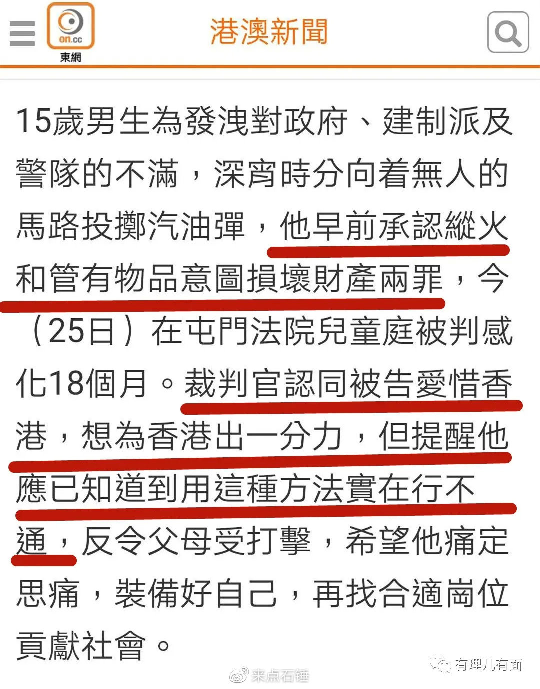 日前,15歲男生為發泄對政府、建制派和警隊的不滿,在晚間向馬路上扔汽油彈,被捕後自己承認縱火和有意圖損壞財產兩罪。但這位人如其姓的水法官不僅只輕判了18月感化,更表示認同被告愛惜香港、想為香港出一份力,竟然還稱他為“優秀的細路”(優秀的小孩子)……