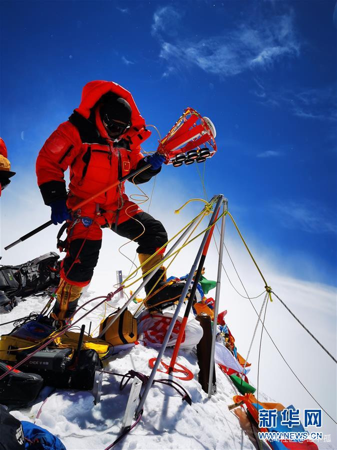 5月27日,2020珠峯高程測量登山隊隊員在峯頂開展測量工作。新華社特約記者 扎西次仁 攝