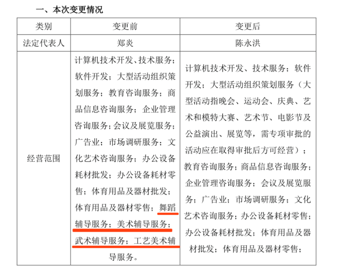 凍結股份,對簿公堂,勤上和龍文算是撕破了臉。2018年12月中旬,勤上股份發佈公告稱,龍文教育進行了法人、經營範圍變更。當時的公告顯示,龍文教育法人由鄭炎變更為陳永洪;企業經營範圍削減了“舞蹈輔導服務”、“美術輔導服務”、“武術輔導服務”“工藝美術輔導服務”。