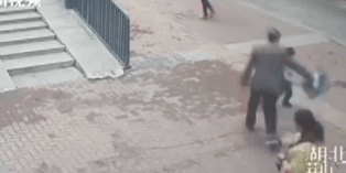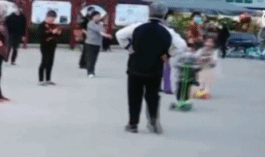 這時一位貌似領舞的老人雙手叉腰,等一個滑着滑板的男孩經過她時,她猝不及防的伸出腳攔住了男孩的滑板車,男孩失去平衡瞬間倒地,看起來摔的挺疼的。