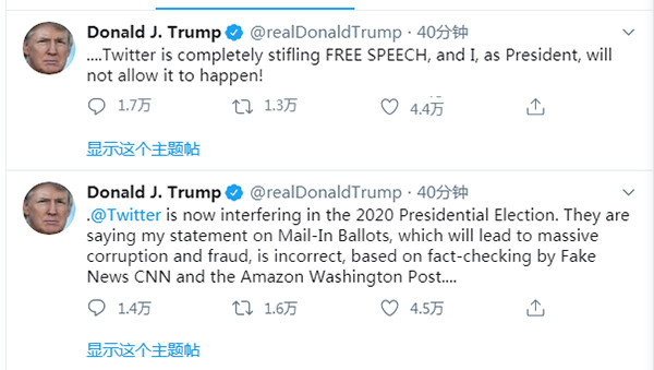 這是推特首次對特朗普所發的推文進行事實核查,也引起了特朗普的反擊。特朗普在隨後發佈的兩則推文中稱,推特“正在干預2020年總統大選”,它“完全扼殺了自由言論”,稱自己作為總統“不允許這樣的事發生”。