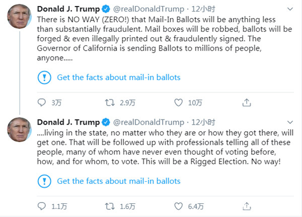 特朗普26日晚發佈的一則有關加利福尼亞州郵寄選票的兩則推文被推特加上了事實錯誤的標籤。特朗普在推文中稱,不會讓加州郵寄選票發生,這會造成“欺詐”,會讓選舉“被操縱”。