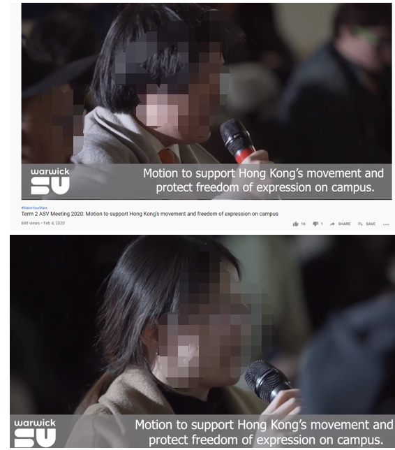 (截圖來自華威大學發佈的辯論會上的視頻,圖為內地學生在揭露香港暴亂分子的真面目,但為了保護他們不會在這篇報道後遭到更多港獨分子的威脅和騷擾,我們選擇給他們的面孔打碼)