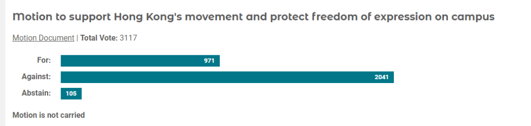 我們先來回顧一下華威大學今年2月的那次投票。學校官網給出的結果顯示,在參與投票的3117名學生中,有2041人反對這項以“支持香港抗議和保護校園言論自由”為幌子的議案。這一高達65%的反對率,也直接令該議案未能通過華威大學的學生會。