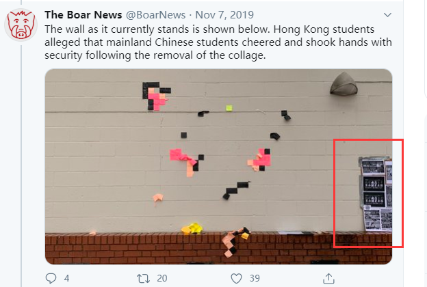 出於謹慎,校方在接到來自內地學生和華裔職員的投訴後,便讓保安清除掉了這個豬頭圖案,但其他被內地學生投訴的涉及香港的虛假宣傳信息,並沒有被移除。