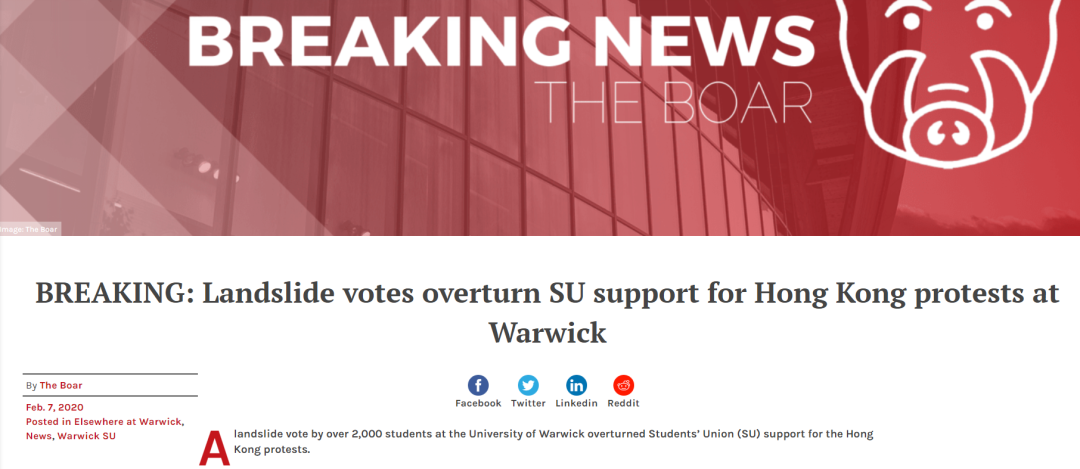 在今年2月初,英國華威大學(University of Warwick)的學生會曾經就一件涉及中國香港的議案,在全校學生內部發起了一個投票。
