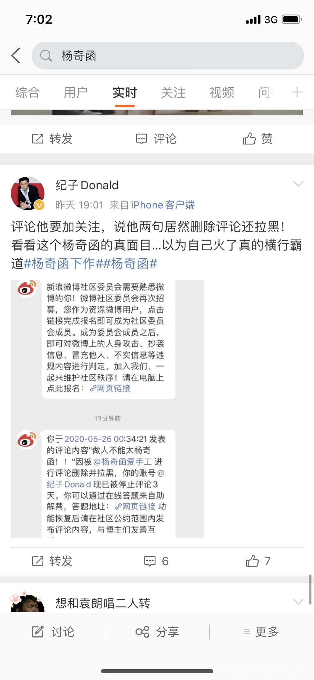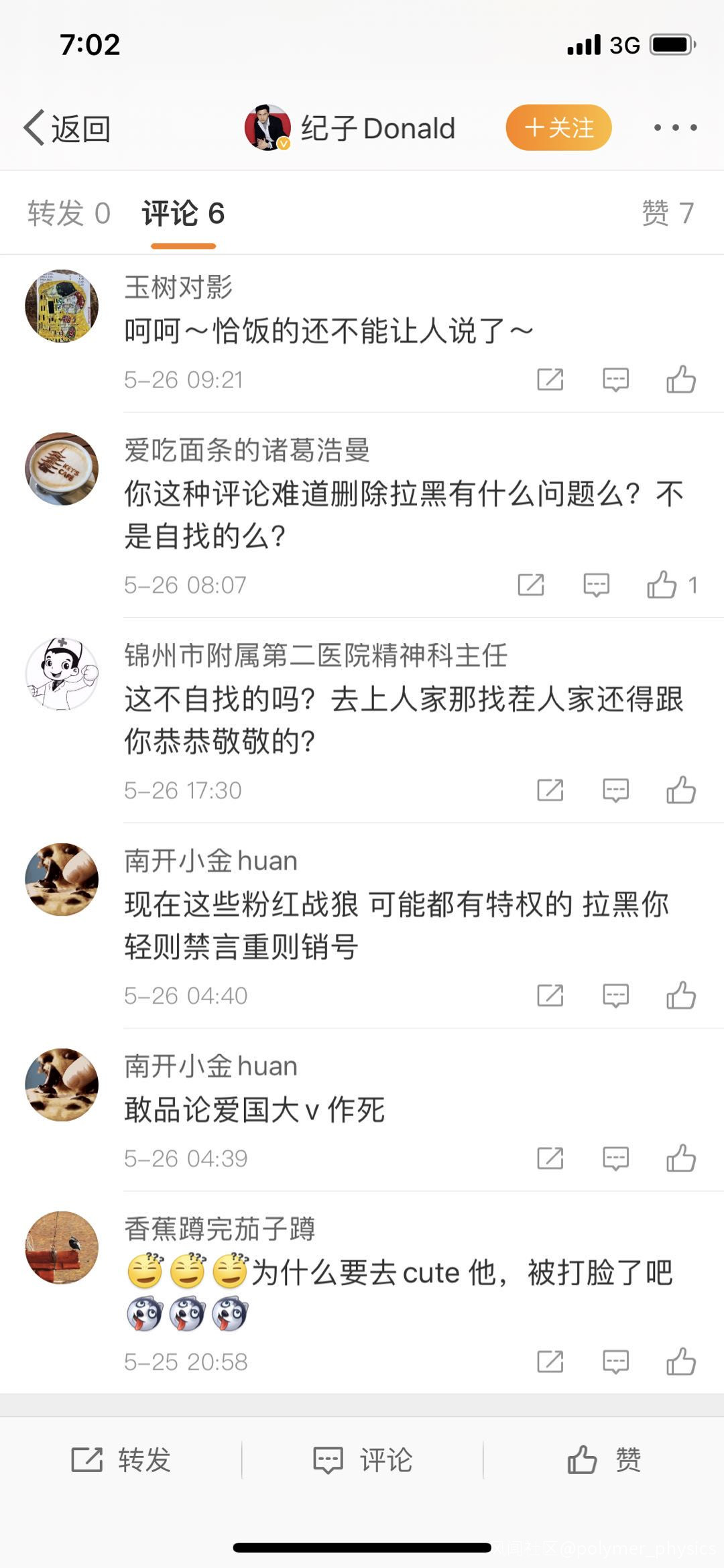 呵呵呵,這些大V,嘴上説楊奇函刪除評論拉黑,您的那句話是屬於言論自由嗎?您這句話是怎麼人身攻擊?是誰在裝可憐?