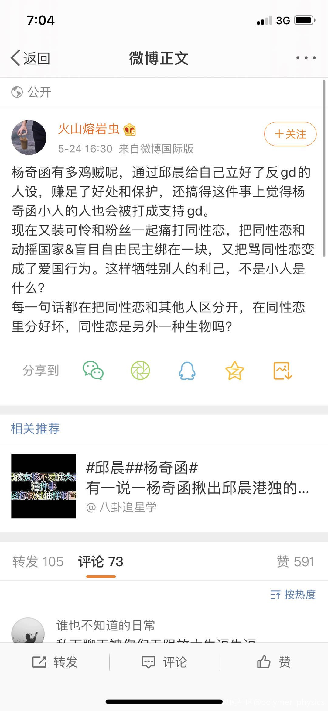 這位同學,邱晨的gd還需要去立人設嗎?gd難道不該人人唾棄?他私下裏的話被錄音被利用被傳到網上,楊本來就是受害者,他自己去找人把自己的話放到網上???您的邏輯呢?他難道不能説自己感受嗎?好了我就是不喜歡txl,你們覺得txl被歧視,那我恐同是不是也要被你們歧視?道理呢?是不是我也可以説你一樣的話。