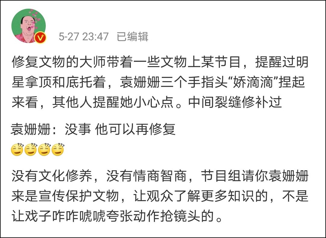 隨意拿文物,還失言稱可以再修復,袁姍姍道歉_風聞