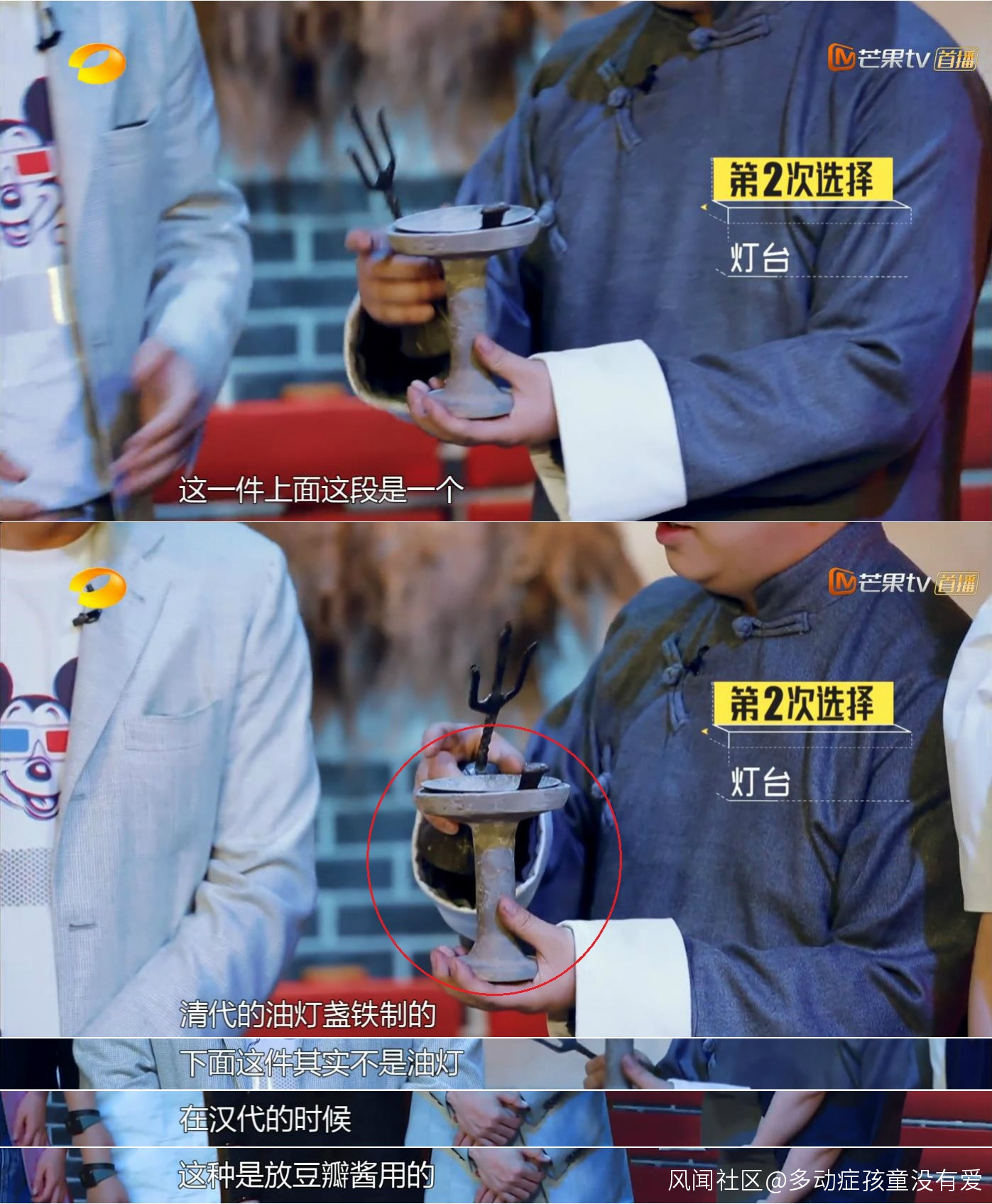 最後,劉胄證實袁姍姍剛才拿起的器物其實只是一件組合式文物,上部是清代時期的鐵製油燈盞,下部是漢代時期放豆瓣醬所用的生活器皿。
