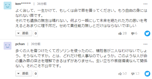 青葉的言論也令日本網友一片譁然。網友憤怒留言稱:“這是什麼魔鬼,希望儘早判死刑”“他做的事情,無論死者是2人還是100人都是殺人罪”“竟然説是2人……是有多麼輕視生命?是不是以為自己重傷了就能被原諒?”“來什麼律師也沒法給他辯護了”。