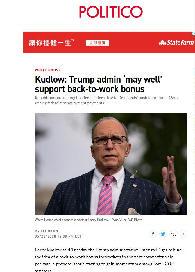 當地時間5月26日,白宮經濟顧問拉里·庫德洛表示,白宮正在研究另一輪刺激失業工人的計劃,用發現金的方式,讓失業工人重返工作崗位,庫德洛稱其為“復工獎金”。據瞭解,這項計劃的主要內容是,如果失業工人重新上班,除了工資以外,還可以在有限的時間內為他們提供每週450美元的額外獎金。
