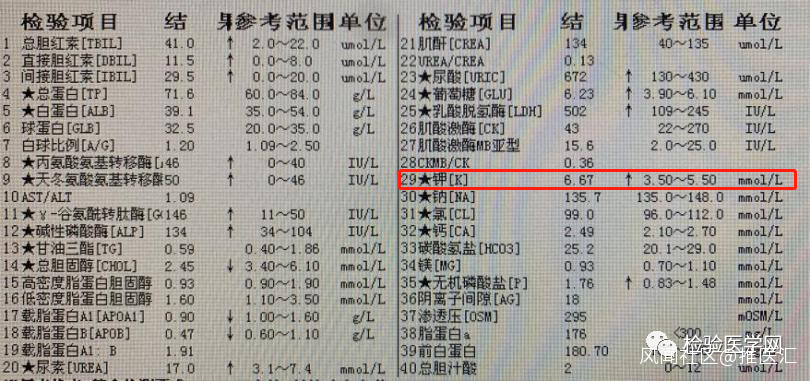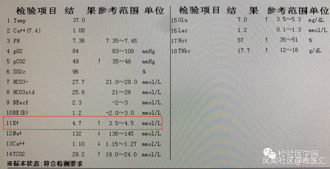 我們都知道造成假性高鉀常見的原因很多,標本分離血清前被冷藏或冷凍?標本未及時處理?用力拍打採血部位?標本被鉀離子污染?溶血?WBC高?RBC高?PLT高?臨牀補鉀?輸入大量庫存血?輸液同側採血?腎臟排鉀減少,急性腎衰?保鉀利尿藥:酸中毒?細胞內鉀外移?洋地黃中毒?甚至PLT/RBC膜結構異常?WBC,RBC,PLT三者過高都有可能會引起假性高血鉀?那你見過三者都很高的患者卻沒什麼高鉀典型症狀的患者嗎?