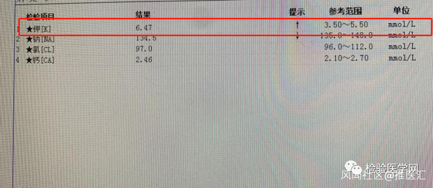 臨牀反應患者心電圖沒有高血鉀表現,症狀也沒有高血鉀的表現,於是與檢驗科溝通,為了排除血標本放置時間以及抽血順序等原因,臨牀立馬規範抽完血,及時又送標本到檢驗科複查。