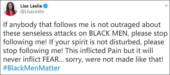 前WNBA傳奇中鋒,名人堂成員麗莎·萊斯莉同樣憤憤不平,“如果任何關注我的人對這些針對黑人的毫無意義的攻擊無動於衷,請取關我;如果你覺得這件事情對你沒有任何影響,請取關我!這件事情給我們(少數族裔)帶來了痛苦,但不會帶來恐懼!”