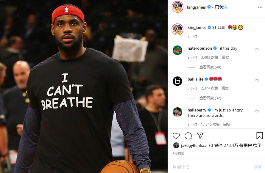 如今,相似的一幕再次重演,詹姆斯怒不可遏,他為圖片配文稱,“(白人警察濫用暴力)依然存在,我依然無法呼吸”。文字的邊上是憤怒、沮喪、不滿的表情。