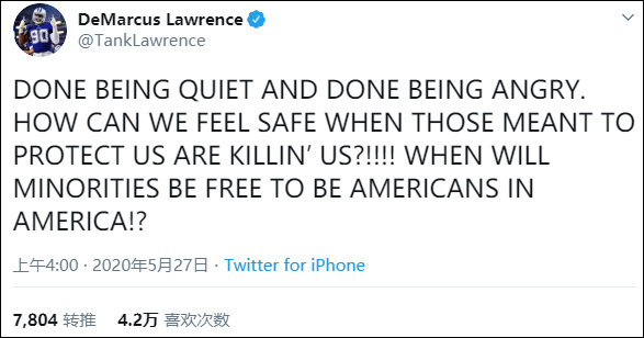 德馬庫斯·勞倫斯在社交媒體上質問,如果那些所謂“保護民眾”的人正在謀殺,還有何安全可言?“少數族裔什麼時候才能自由地做美國人!?”