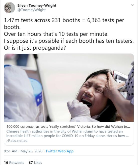 比如,在《華爾街日報》關於武漢大規模檢測的推文下面,有的留言者就直接甩出了 " 武漢病毒 " 這個標籤,有的則宣稱這種強制檢測是 " 不自由 " 的,是 " 拿槍頂着腦子 " 做出來的,還有人指控報道此事的美國媒體 " 通中 “,指控這些媒體故意不説病毒是中國傳染給全世界的。但這些無腦黑的觀點都遭到了評論中其他網民的駁斥。但在一些反華或敵視中國的賬號下面,評論裏就是純粹的惡臭撲面了。比如下圖中這個敵視中國的澳大利亞民間賬號就宣稱武漢的檢測規模只是一種 " 宣傳 “,根本做不到一天能檢測那麼多人。他的評論也充斥着 " 共產黨説的什麼我都不信 " 這樣的留言。