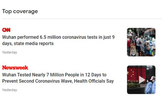 如下圖所示,CNN、《紐約時報》、《新聞週刊》以及彭博社,都在他們的報道標題中,直接明瞭地突出了武漢此次在 " 僅僅 9-12 天 " 裏就檢測了 “650 萬 -700 萬人 " 的信息。