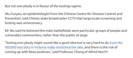 另外,澳大利亞廣播公司和《紐約時報》還在報道中提到,中國疾控中心流行病學首席專家吳尊友也曾在接受中國央視採訪時表示 " 主要針對重點地區、重點人羣進行核酸檢測,不必要人人都做 “。